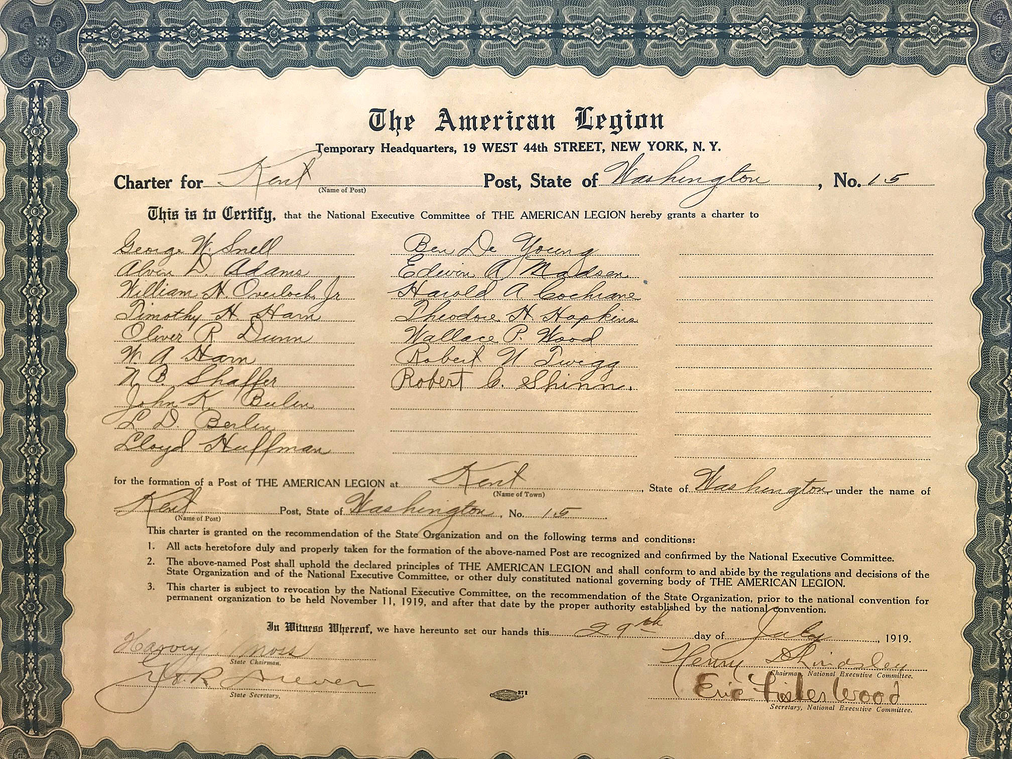Did you know?: Kent American Legion Post 15 was one of the very first units organized anywhere. Its charting document, which is on display, was signed in New York City on July 29, 1919. It bears the names of 17 founding members who were Kent-area WWI veterans.