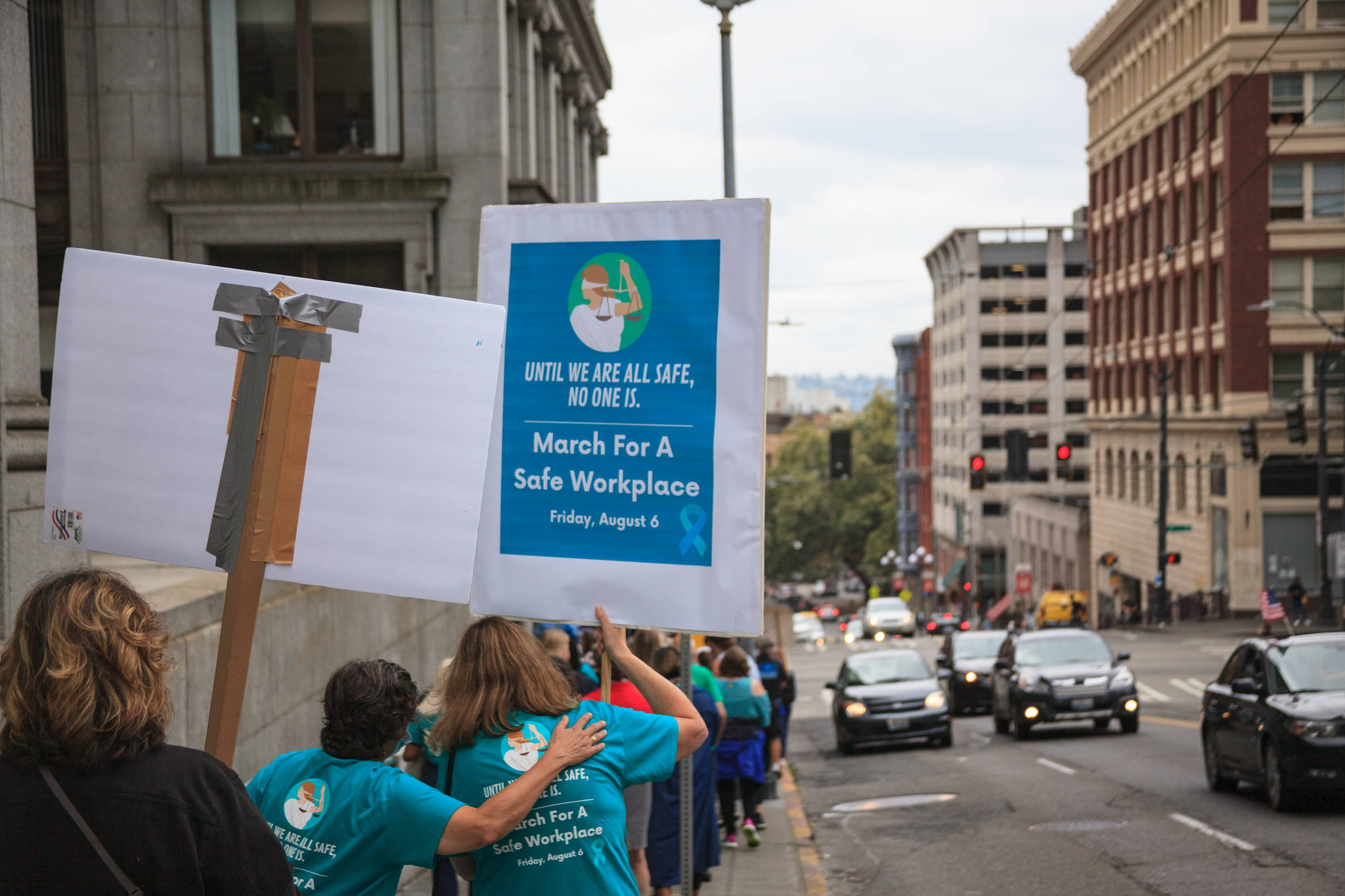 The march was organized after a man assaulted a woman in the bathroom of the King County Courthouse on July 29, 2021. Workers who spoke during the march said the attack in July was only the latest in a long line of violent incidents in and around the courthouse.