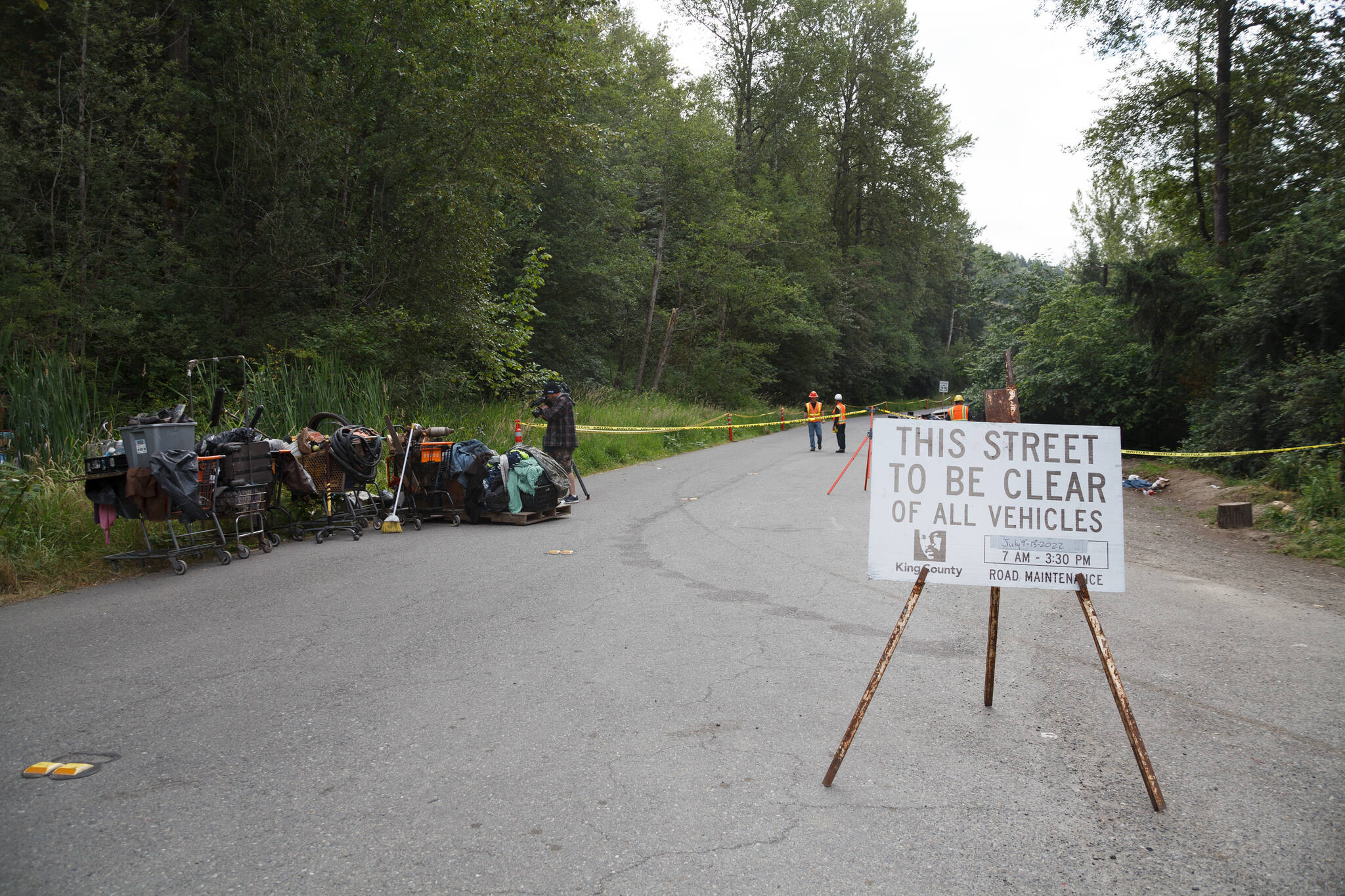 The cleanup came after a three-day-long effort by workers with the King County Regional Homeless Authority and several non-profits to connect people experiencing homelessness with shelter and resources. Cars and RVs parked along the road were notified they had to move prior to the cleanup.