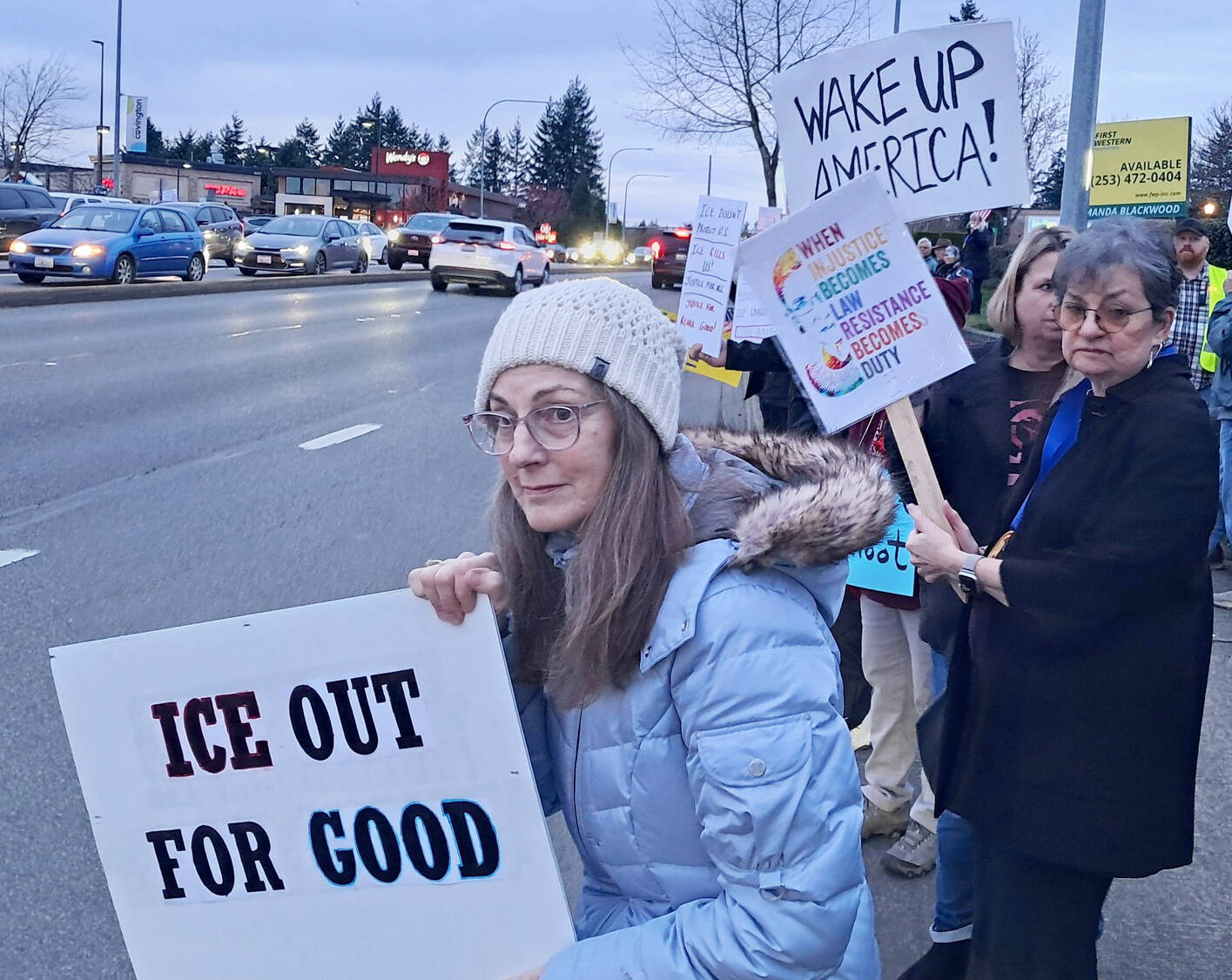 As they have in previous protests last year against the Trump administration, demonstrators gathered in Covington along SE 272nd Street (aka Kent-Kangley Road) and Highway 18, just east of Kent.