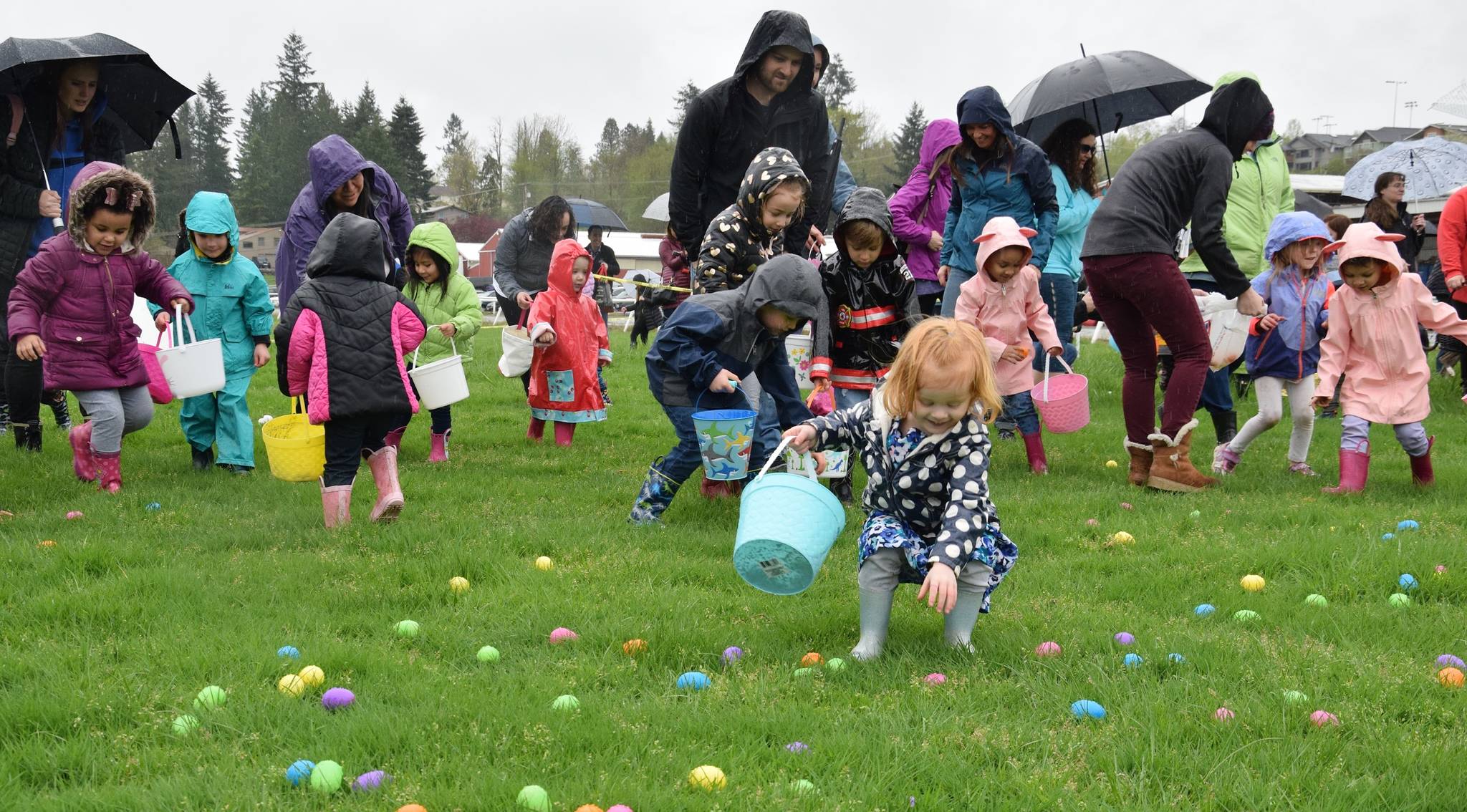 Children of all ages scrambled to fill their baskets and buckets despite a damp, wet day.