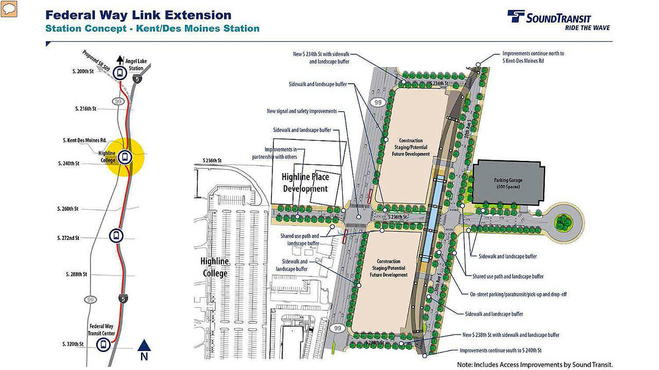 Sound Transit plans to build a 500-space garage at the south 272nd station on the Kent/Federal Way border to go along with about 600 surface spots and construct a 400-space garage at the Federal Way Transit Center to add to the 800 surface parking spots.