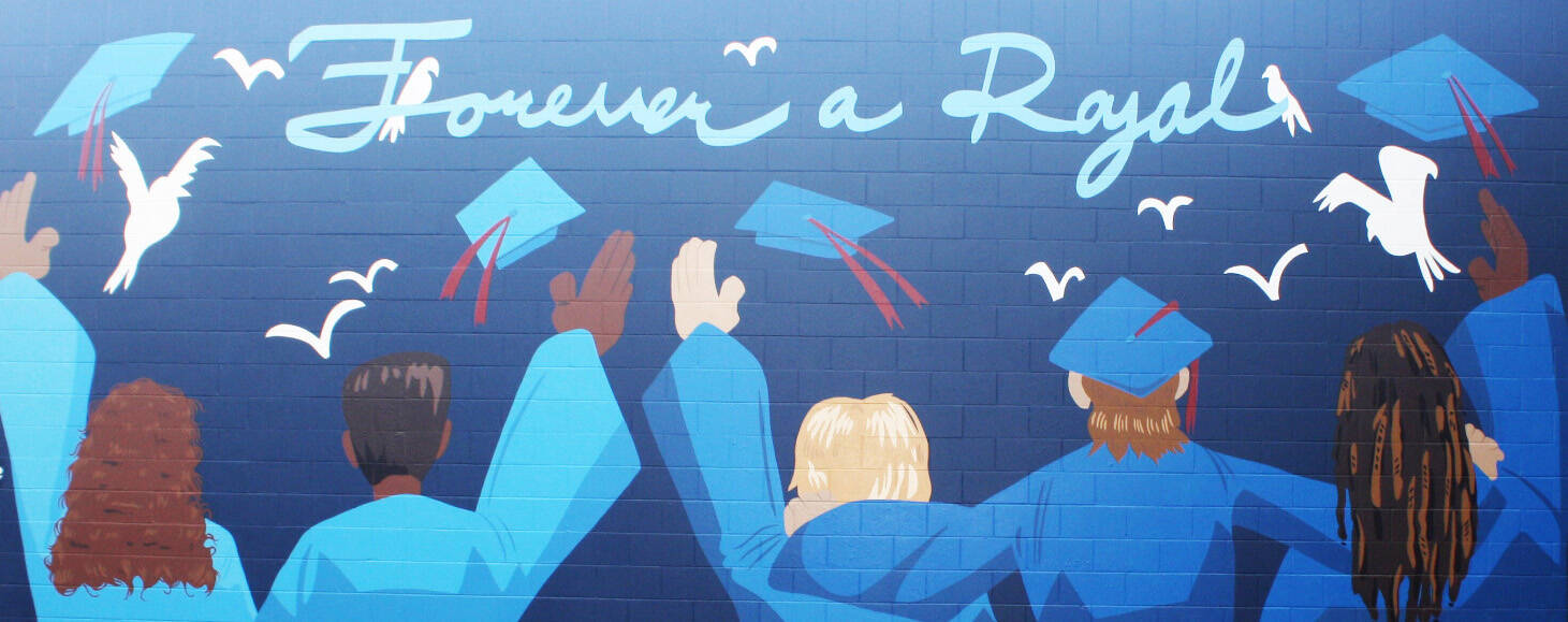 They will see a student-inspired artwork featuring five students in blue graduation gowns looking skyward with arms raised or around each other, graduation caps, red tassels and white doves flying in the air and the words Forever a Royal, atop the painting.
