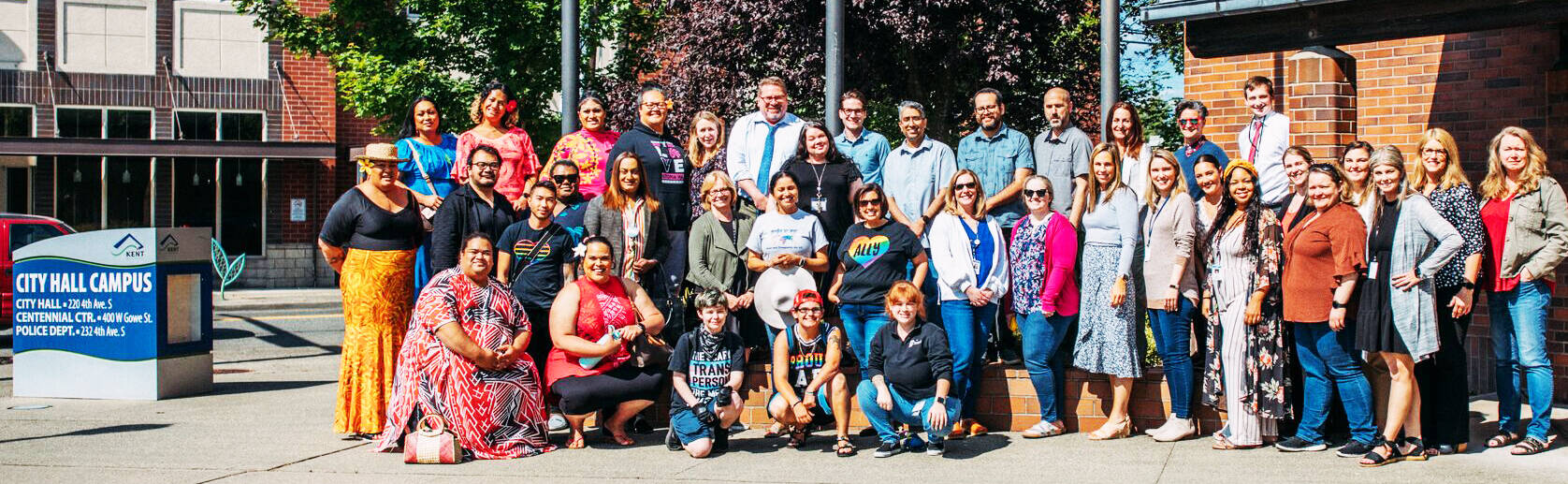 Members of the United Territories of Pacific Islanders Alliance (UTOPIA), Kent Youth and Family Services staff and Kent City Councilmembers Satwinder Kaur and Marli Larimer raised the Pride flag at Kent City Hall.
