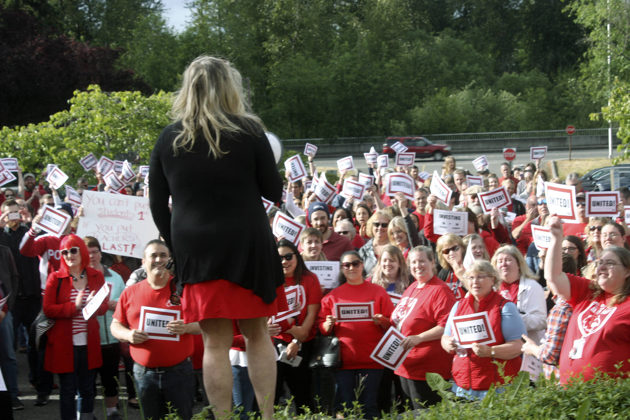 A red-clad wave of teachers rallied outside the Kent School District Office on Wednesday evening, calling for higher pay and better treatment from district leaders who are tackling a budget deficit.