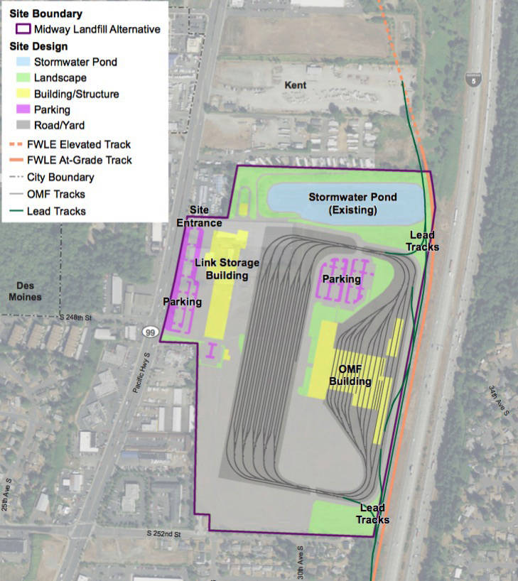 The Kent site under consideration by Sound Transit for a light rail Operations and Maintenance Facility would take the longest to build (six to eight years) and be the most expensive to construct ($1.7 to $2.8 billion) compared to two Federal Way alternative sites.