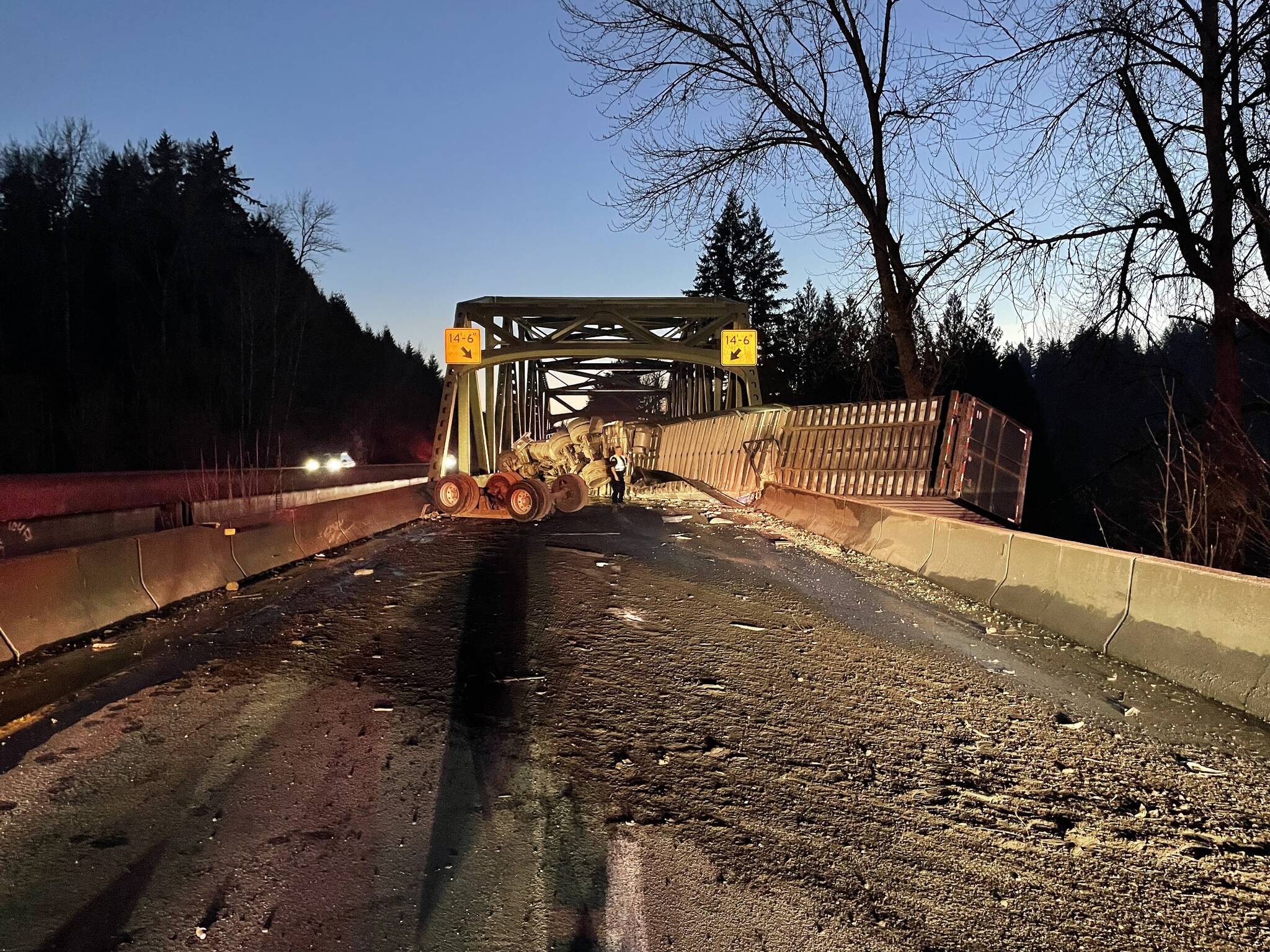 The rollover of a semi-truck in the early morning on Tuesday, March 19, atop the Green River Bridge in Auburn resulted in a full blockage of all lanes on eastbound State Route 18.