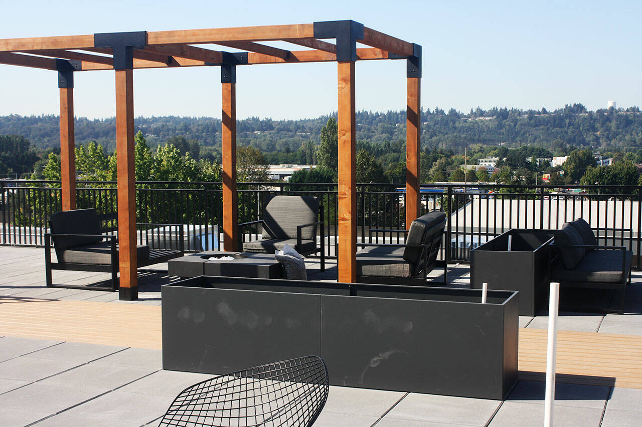 A 12,456-square-foot rooftop patio includes lounging areas, a turf and dog run, barbecues and views of Mount Rainier to the south.