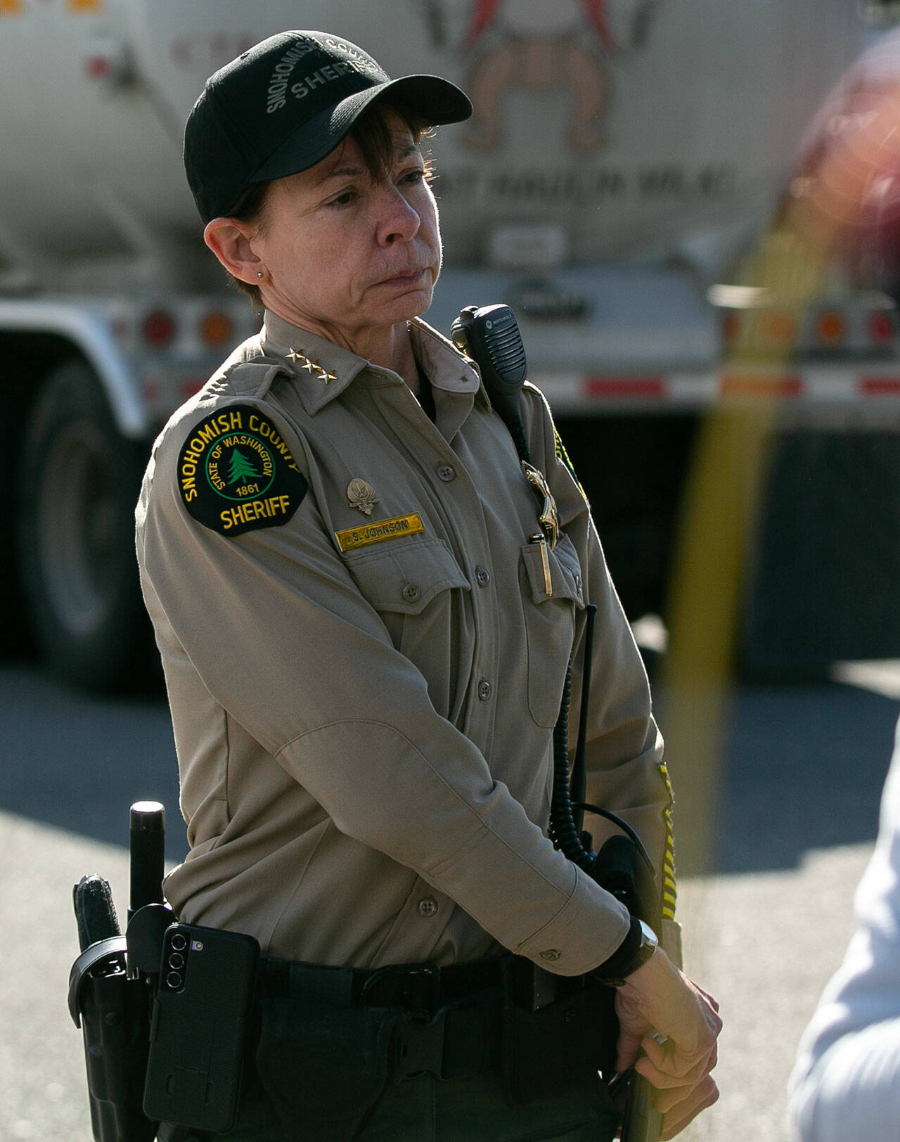 About 25 somber Washington State Patrol troopers gathered around 1:30 p.m. for a media briefing, joined by Snohomish County Sheriff Susanna Johnson. Flanked by troopers, Washington State Patrol Chief John Batiste said Gadd was a “good trooper and even better human being.”