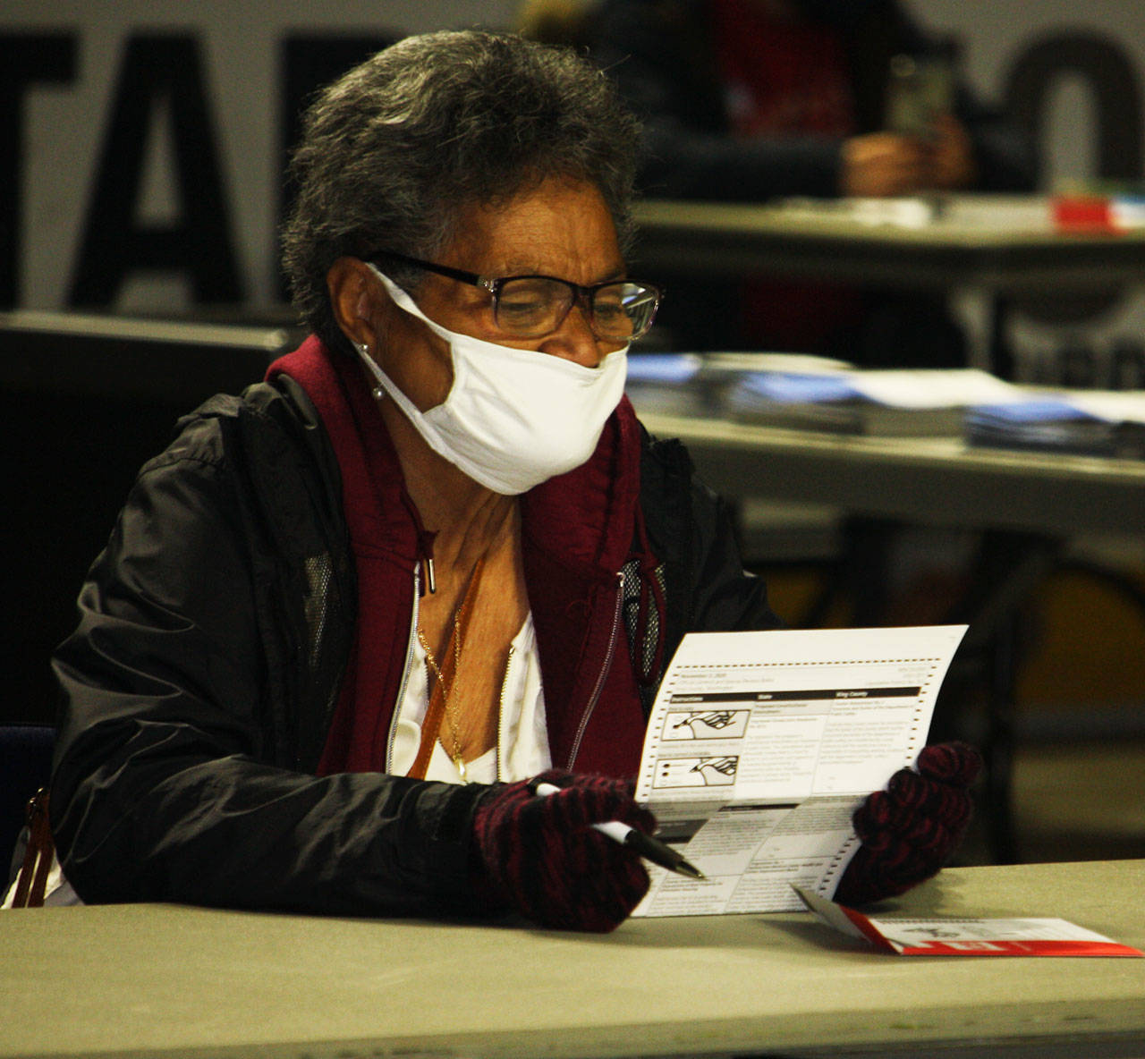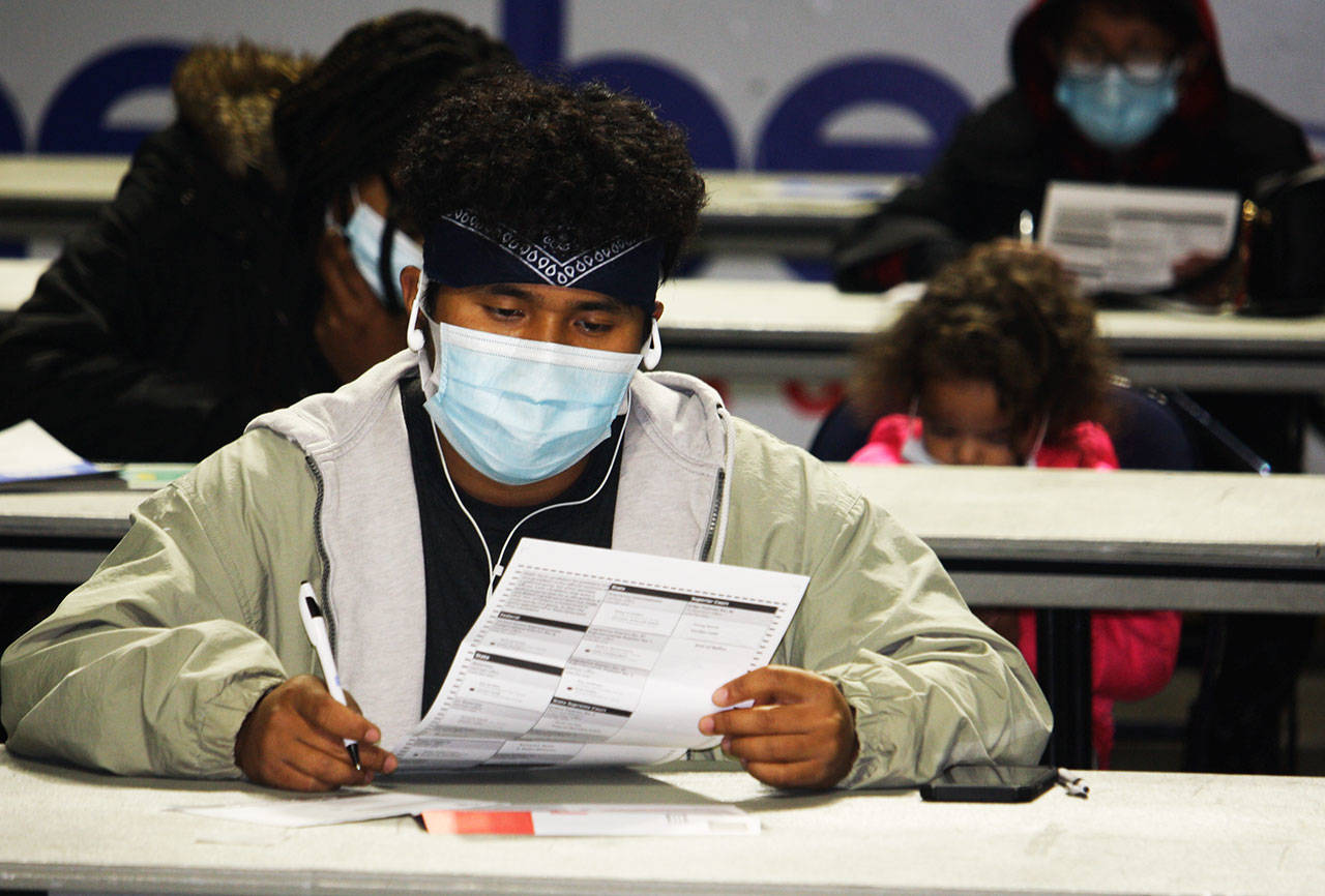 They didn’t have to wait outside as the line stretched along the concourse as people waited to enter the main floor so they could register and vote, update their current voter records or get assistance from trained Elections staff to complete their ballot.