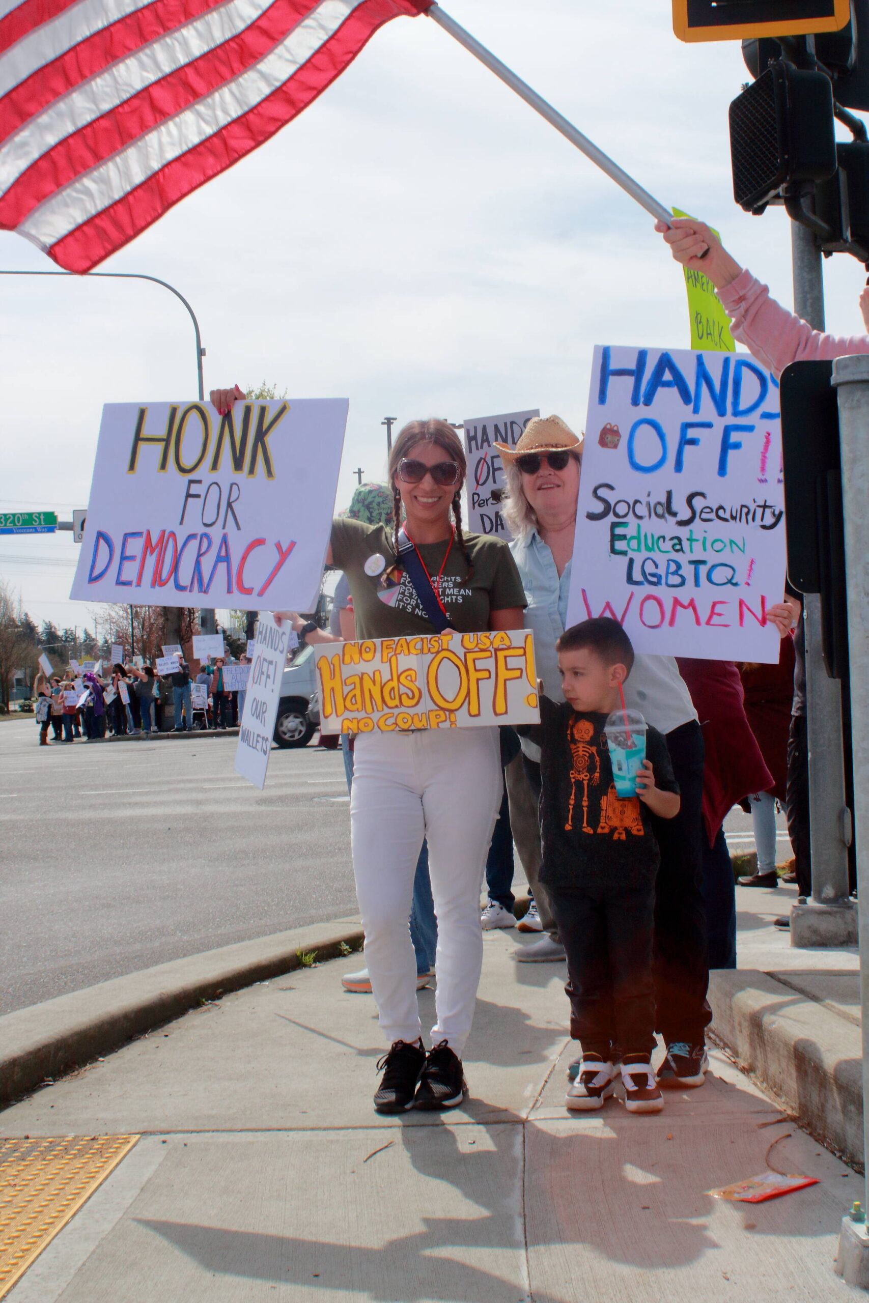 The Federal Way demonstration was organized by Madelyn Grayson, a citizen of Federal Way who heard about the Hands Off protest and decided to register Federal Way. Grayson said even if she was the only one out there on the corner with a sign, it was worth it to try.
