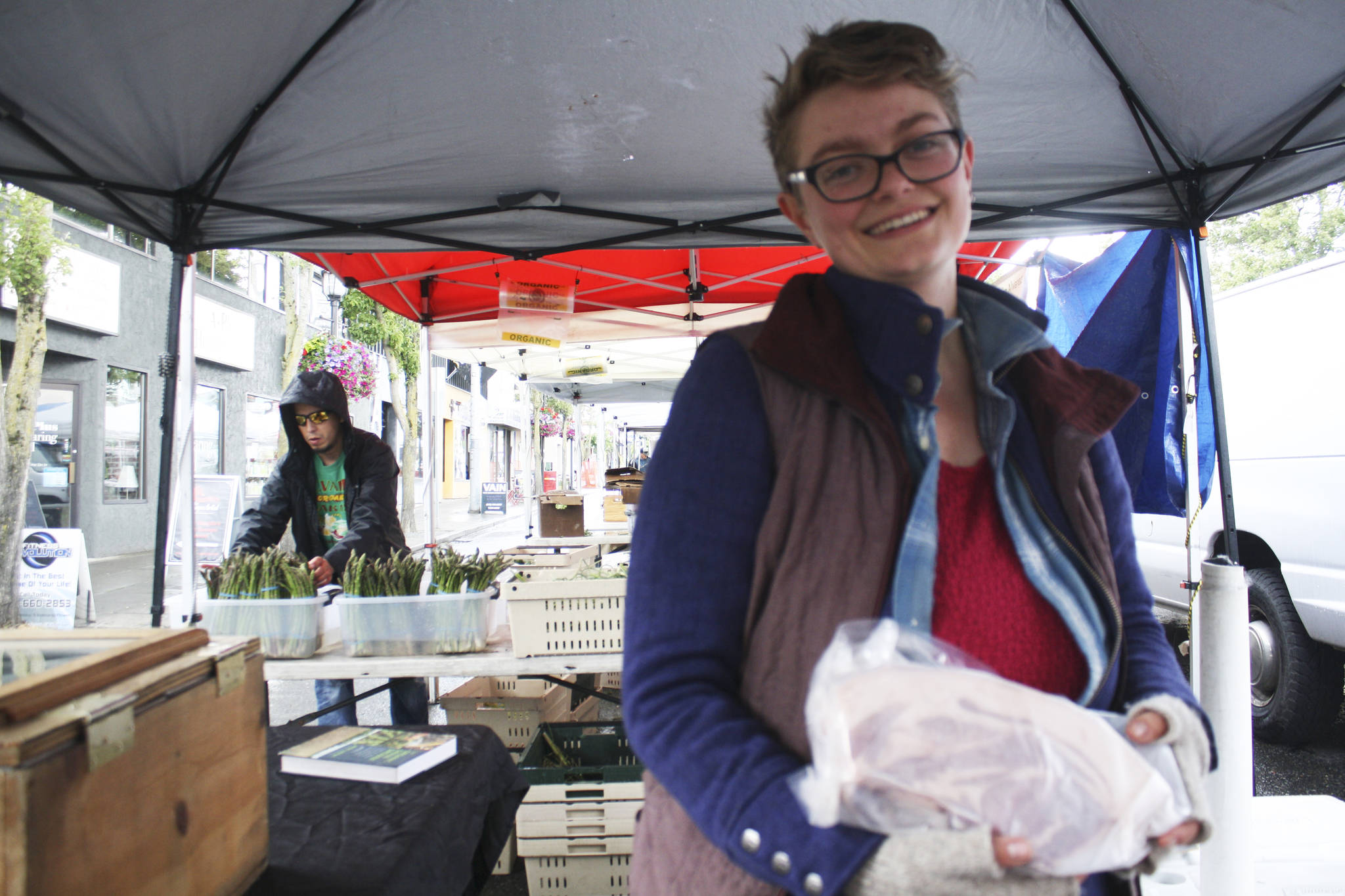 WEST SEATTLE — A stream of pedestrians saunters through the cordoned-off main street of West Seattle Junction on Sunday, their figures silhouetted against a blanket of gray sky. Potted flowers, slabs of cheese, and bins overflowing with leafy greens rest beneath covered stalls that line the pavement. Some of the crowd huddles under umbrellas as they pick out fresh local produce, while others wait in a nearby line for fresh flour tortillas. The pastoral scene at the West Seattle Farmers Market is thrown into sharp relief by the busy California Avenue Southwest and Alaska Street intersection, which teems with cars and cross-walking Sunday brunchers.