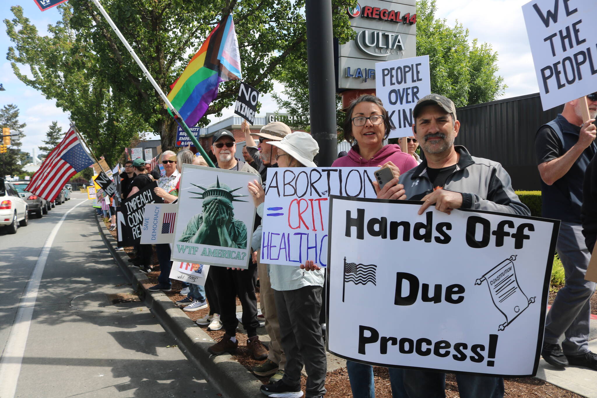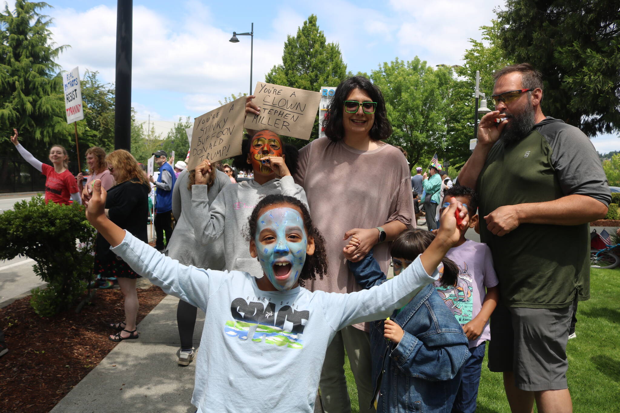Covering one-third of a mile, from the Top Golf to the edge of the parking lot at The Landing, with the corners of Logan Avenue and North 10th Street serving as the nucleus, Renton held its “No Kings” protest where well over 5,000 people filled the sidewalks, adorned in clown noses, carrying signs and chanting in protest of the Trump administration.