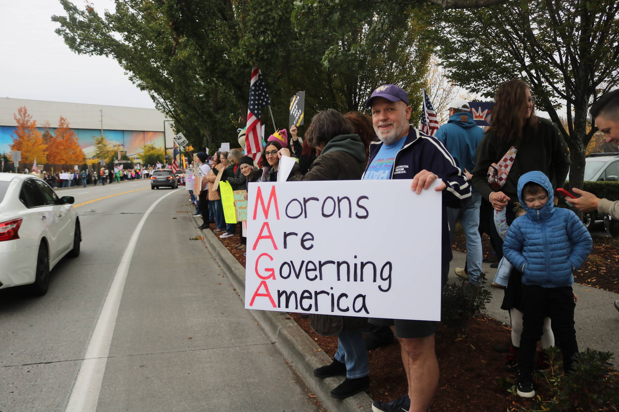 At 10 a.m. Saturday, Oct. 18, at the intersection of Southeast Petrovitsky Road and 140th Avenue Southeast, hundreds filled the intersection sidewalks, some wearing costumes and most everyone holding a sign in protest of the Trump administration.
