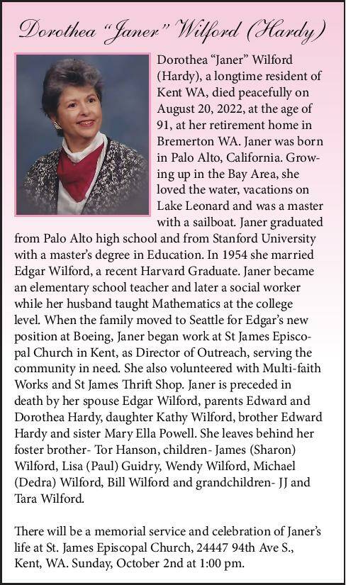 Dorothea “Janer” Wilford (Hardy), a longtime resident of Kent WA, died peacefully on August 20, 2022, at the age of 91, at her retirement home in Bremerton WA. Janer was born in Palo Alto, California. Growing up in the Bay Area, she loved the water, vacations on Lake Leonard and was a master with a sailboat. Janer graduated from Palo Alto high school and from Stanford University with a master’s degree in Education. In 1954 she married Edgar Wilford, a recent Harvard Graduate. Janer became an elementary school teacher and later a social worker while her husband taught Mathematics at the college level. When the family moved to Seattle for Edgar’s new position at Boeing, Janer began work at St James Episco- pal Church in Kent, as Director of Outreach, serving the community in need. She also volunteered with Multi-faith Works and St James Thrift Shop. Janer is preceded in death by her spouse Edgar Wilford, parents Edward and Dorothea Hardy, daughter Kathy Wilford, brother Edward Hardy and sister Mary Ella Powell. She leaves behind her foster brother- Tor Hanson, children- James (Sharon) Wilford, Lisa (Paul) Guidry, Wendy Wilford, Michael (Dedra) Wilford, Bill Wilford and grandchildren- JJ and Tara Wilford.