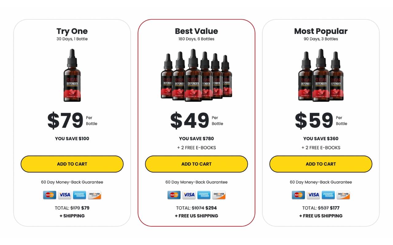 - 6 Bottles: For those looking to stock up on Sugar Defender, the 6-bottle package offers the best value. Each bottle in this package is priced at $49, totaling $294 for the entire set. Similar to the 3-bottle package, you will receive free shipping and 2 FREE E-BOOKS as part of this deal.