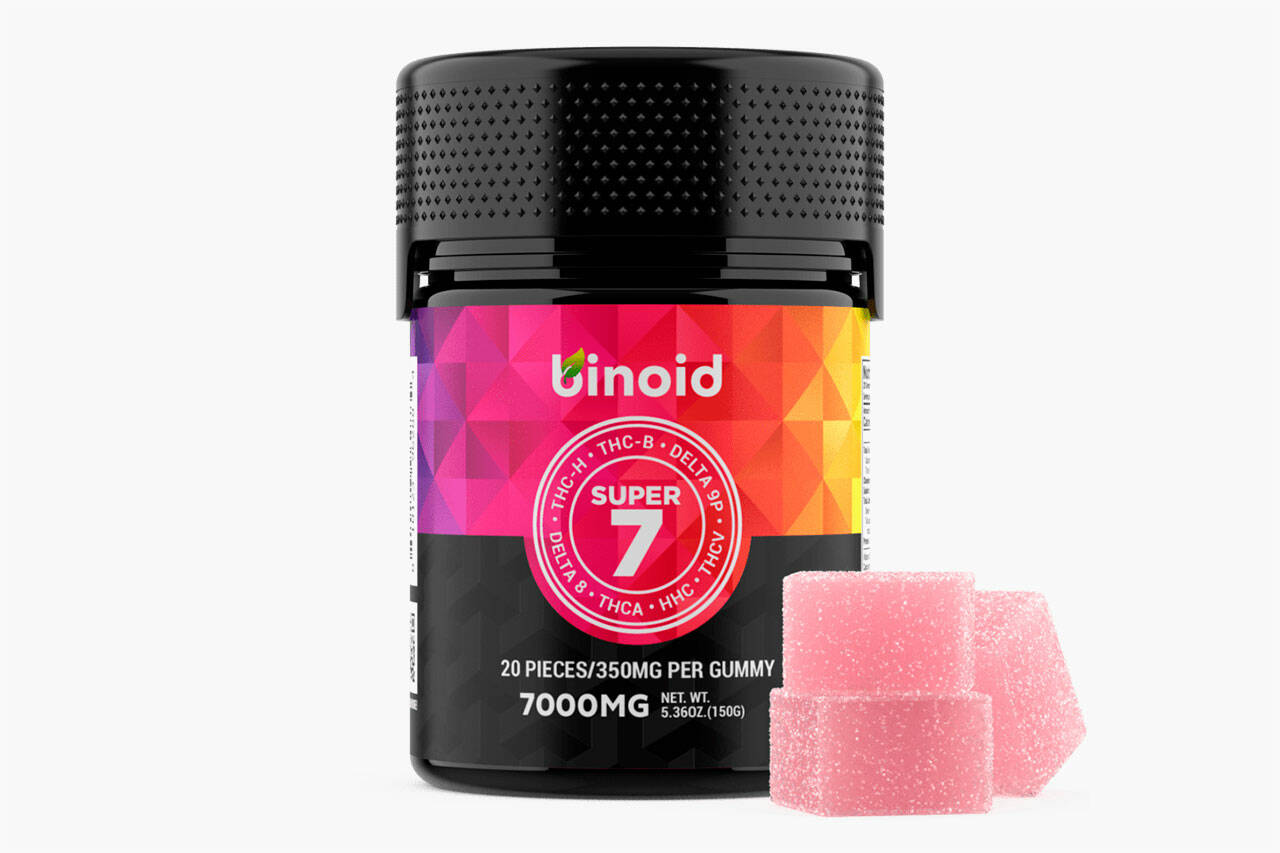 Super 7 Gummies 7000 MG! These are not your average gummies. They’re part of the Binoid product collection’s grand finale and boast a revolutionary THCA blend. Combine THC-H, THC-B, Delta 9p, Delta 8, THCA, HHC, and THCV into one gummy.