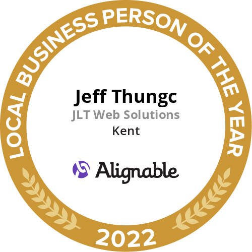 Jeff’s exceptional service, local involvement and attention to detail as a web designer stands out—so much so that Alignable.com, the largest online referral for small businesses, chose Jeff as Kent’s Business Person of the Year for 2022! Jeff and JLT Web Solutions was chosen from over 2,400 local business nominees because he has consistently gone above and beyond, guiding peers and supporting his community as it strives to recover from the effects of the pandemic. Prior to that, Jeff was recognized as Kent’s Business Person of the Year for 2021!