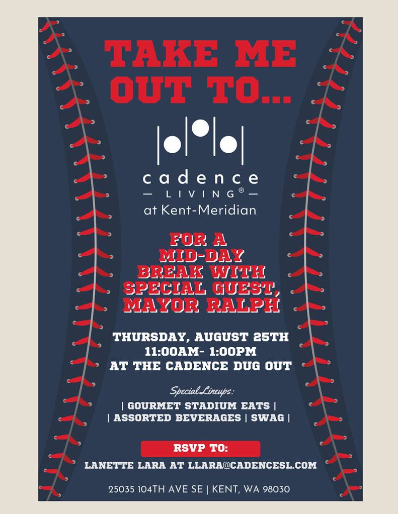 Take a mid-day break in the Cadence Dug Out on Aug. 25, with special guest Mayor Ralph! Enjoy gourmet stadium eats, assorted beverages, swag and explore the amazing amenities at Cadence at Kent-Meridian.