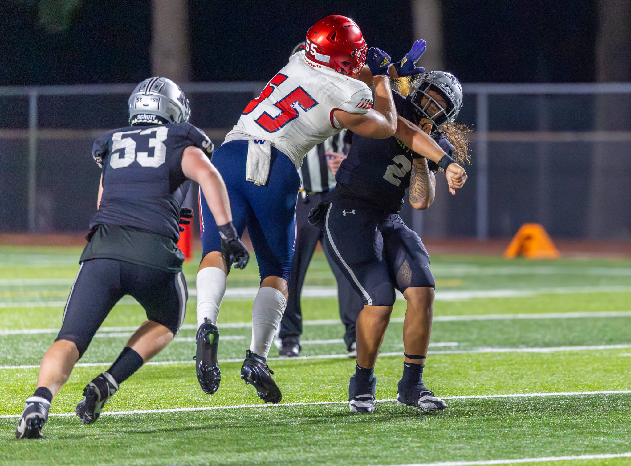 Starting quarterback Brandon Tagle was sidelined with an illness and wasn’t at the game against the Lancers at all. Not only did Kentwood match up with a quarterback getting his first start, but the number one football recruit in all of Washington state was back from an injury. Derek Coleman-Brusa, who is a University of Washington commit, stands 6 feet 6 inches tall and is listed at 285 pounds. Kentwood’s Logan Thomas and Nate Whitham are its taller players, and both stand at 6 feet 4 inches. The offensive line went up against one of the best defensive line units in the state.