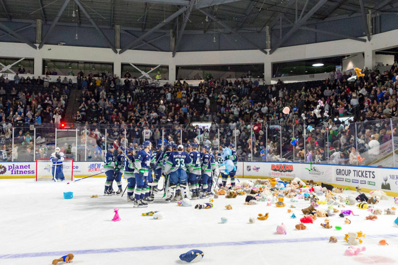 A season-high crowd of 5,054 attended the Western Hockey League game Saturday, Dec. 3 at accesso ShoWare Center in Kent. The bears were tossed after the T-Birds scored their first goal en route to a 3-0 win over the Victoria Royals. The bears will be donated to Salvation Army to distribute to children.