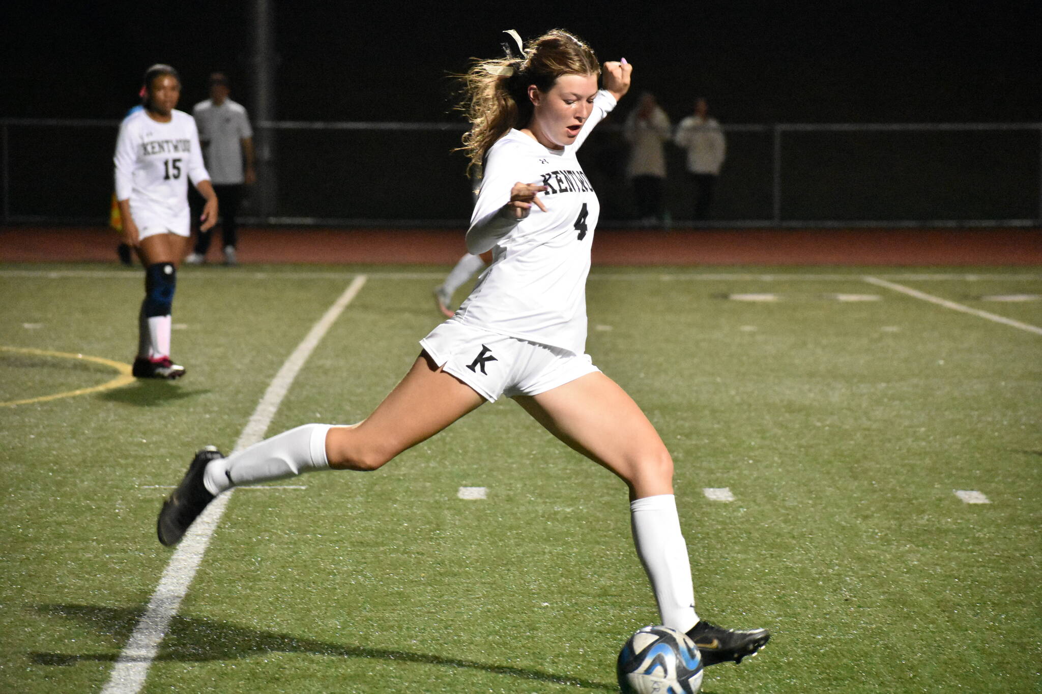 Not longer than a minute later, Zoey Slind hit a free kick from 50 yards out. Her ball into the box was by no means a shot, but it found the back of the net. It put Kentwood keeper Logan Mabalay in an awkward position, and the ball bounced right over her head and in the goal.